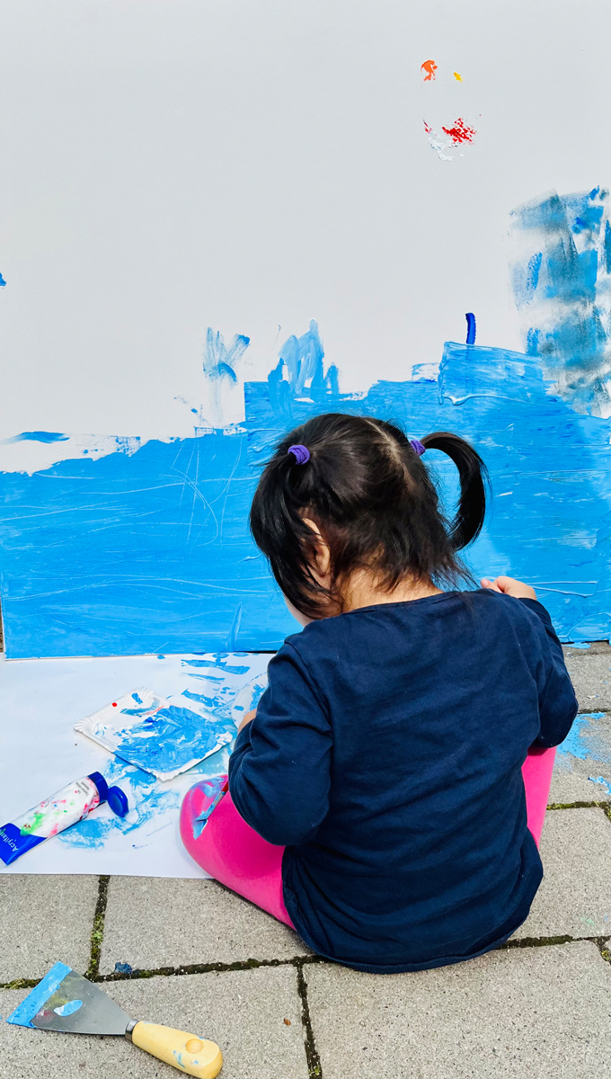 Beim Sommerfest von fördern und wohnen trafen Kinder und Erwachsene, unterschiedlicher Nationalitäten, mit und ohne Behinderung aufeinander. Neben Hüpfburg, Kinderschminken, Musik und internationalen Leckereien, gab es die seltene Gelegenheit sich frei und auf die ganz eigene Art auf großen Leinwänden künstlerisch auszudrücken. Dabei halfen die Akteurinnen von zusammenkultur auf Englisch, auf Deutsch oder mit Gesten. Sie zeigten zum Beispiel einer Mutter, wie diese ihren Sohn unterstützen kann selbst zu malen, obwohl der Junge keinen Pinsel halten kann. Manche Eltern sahen zum ersten Mal, wie künstlerisch ihre Kinder sind und trugen die Kunstwerke am Abend stolz nach Hause.