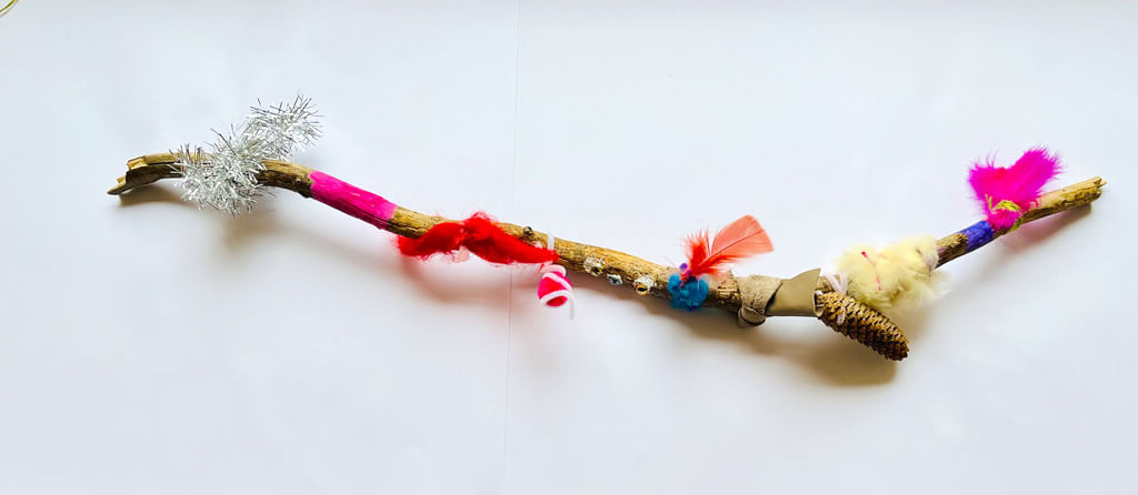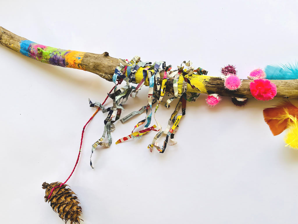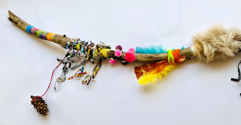 Es lagen auch alle Materialien und Farben nochmal bereit, die wir in den verschiedenen Impulsen genutzt haben, auch viele bunte Bänder, Bastelkleber, Glasaugen, Federn etc.. Wir leiteten die Kinder und ihr Begleitung an, sich noch einmal an die Reise durch die Tage zu erinnern: "Beginne am unteren Ende des Stockes mit der frühesten Geschichte und wähle dafür Material und Farbe. Wenn Du magst erzählt ihr einander die Geschichte, die Du in den Stock hinein gibst, während Du Bänder oder Farben oder anderes auf den Stock bringst. Versuche gerne auch Muster oder Astlöcher, die sich im Stock zeigen mit in Deine Geschichte und Gestaltung einzubinden, sie zu verstärken oder raus zu arbeiten."