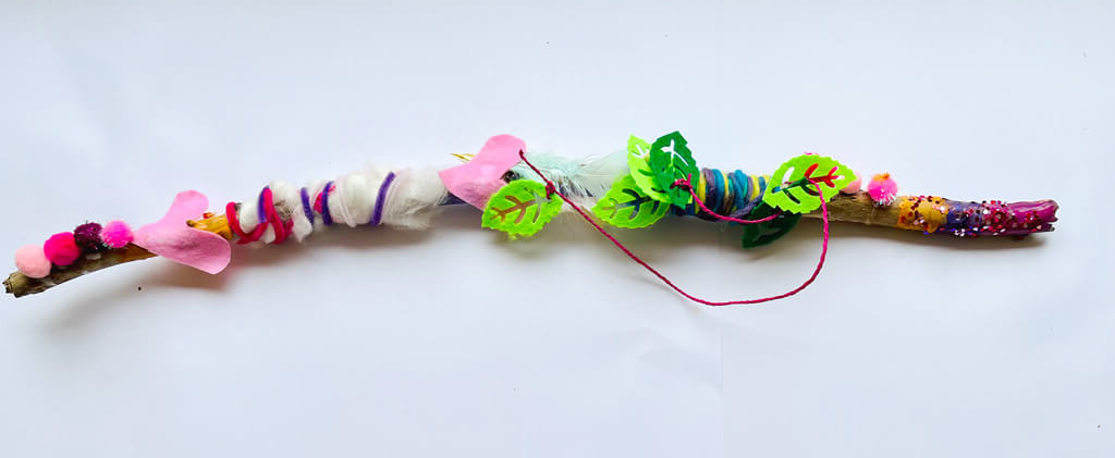 Es entstanden sehr bunte, vielseitige Stöcke, die dazu einladen die Geschichte auch zu erfühlen und die die Kinder mit ihrer Begleitung auch gut anschließend über ihrem Bett an die Decke hängen können.
