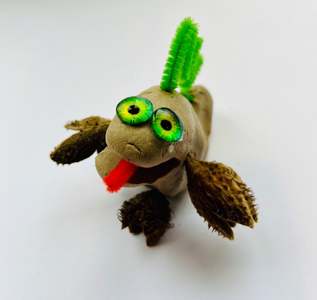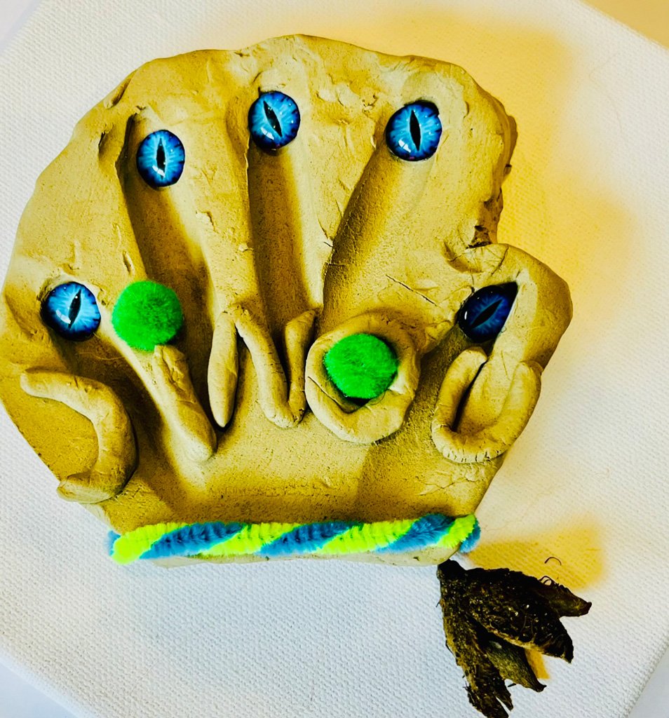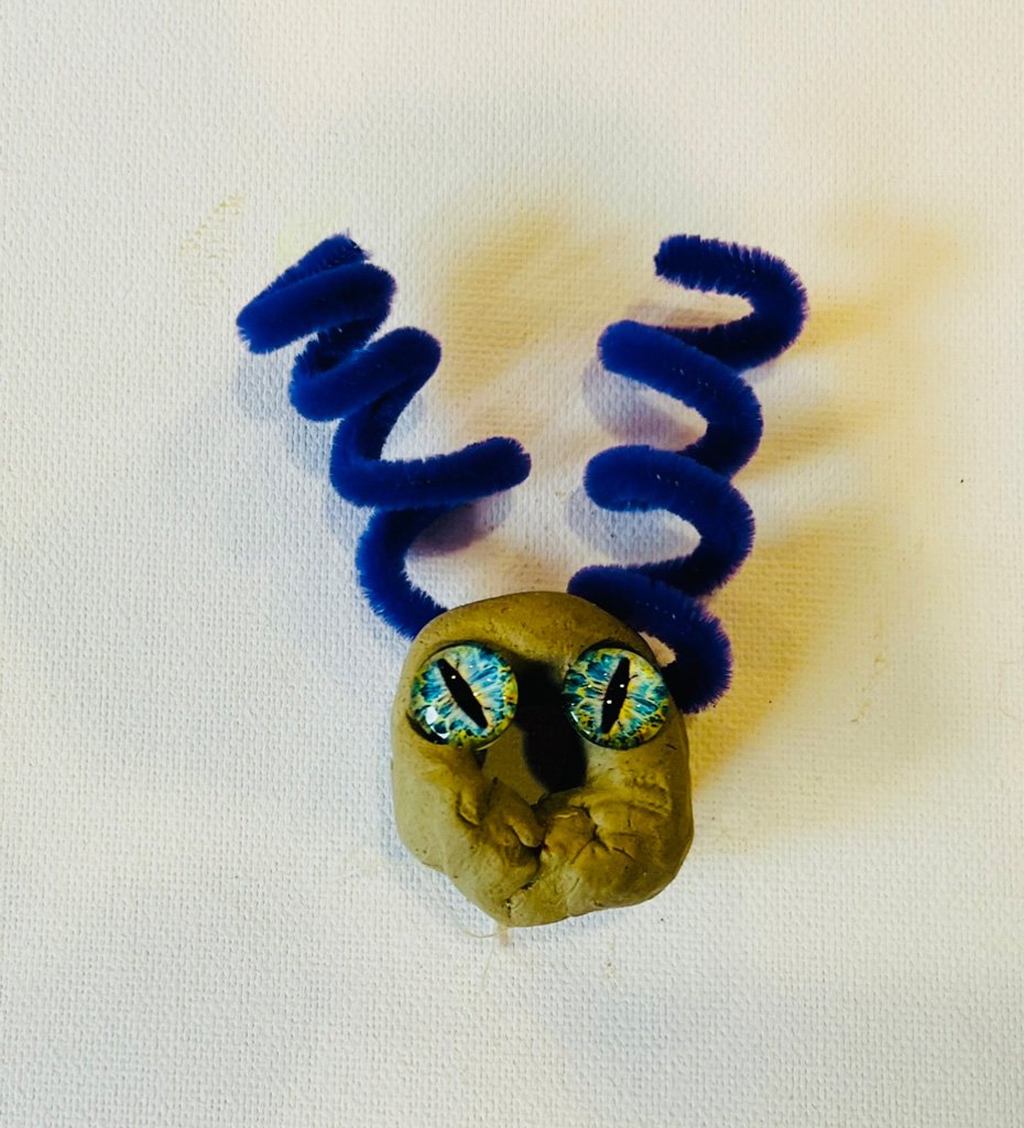 Am nächsten Tag wurde diese oder ggfs. auch neu Tonkugeln mit verschiedene Kreativmaterialien gestaltet. Besonders die Glasaugen gaben dem Tonkopf sofort ein Gesicht, Federn, Märchenwolle und verschiedene Bänder, sowie die Fell- oder Lederreste kamen zum Einsatz in der Gestaltung eines ganz eigenen Tonwesens.