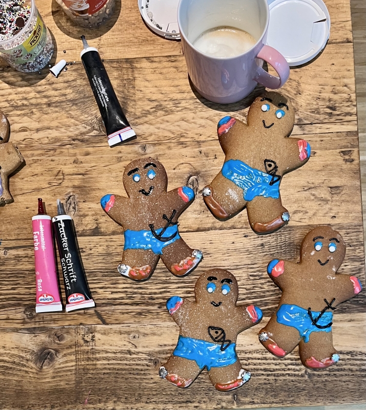 140 vorab gebackene Lebkuchenfiguren und reichlich Dekorationsmaterial wurden von den Teilnehmern in kunstvolle Werke verwandelt. Piraten, Bikini Girls, Fußballfans, Lebkuchenpaare und -familien entstanden mit Zuckerschrift, Perlen und selbstgemachten Farben.